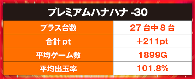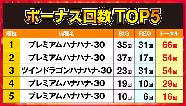 「プレミアムハナハナ-30」から4台がランキング入りをはたし、ボーナス回数66回を記録した台がトップ!