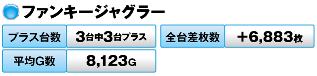 3台すべてがプラスで全台差枚数は+6,883枚、平均G数は8,123Gを記録した。