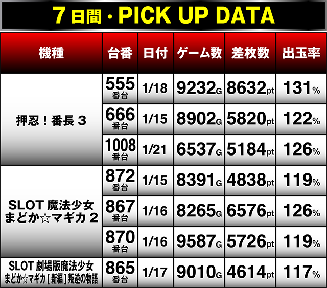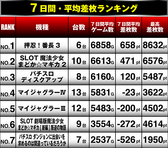 ・SLOT魔法少女まどか☆マギカ2やパチスロディスクアップも7日間の平均差枚数プラス!