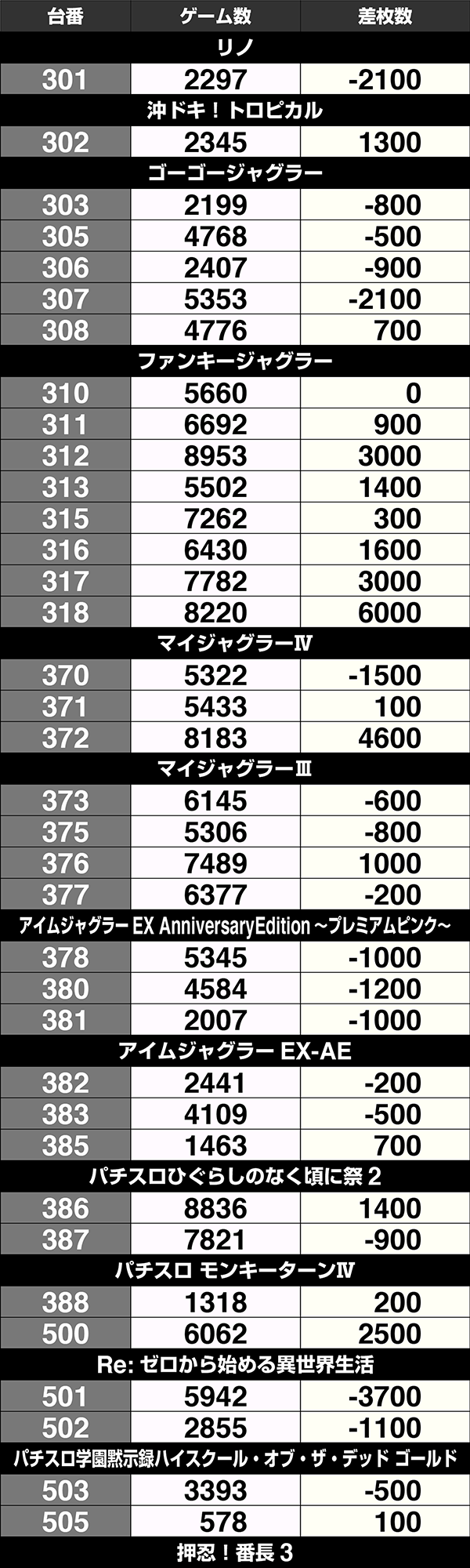 11台がプラス+3000ptを上回り、合計差枚数は+44300ptを記録した。
