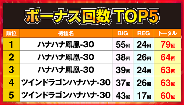 1位から3位を「ハナハナ鳳凰-30」が独占しており、ボーナス回数79回の台が首位を獲得!!