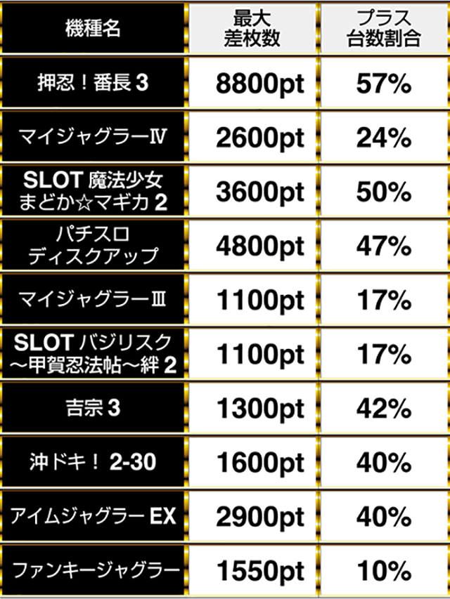 4800ptの台があった『パチスロディスクアップ』は、4割以上の台がプラスptとなった。