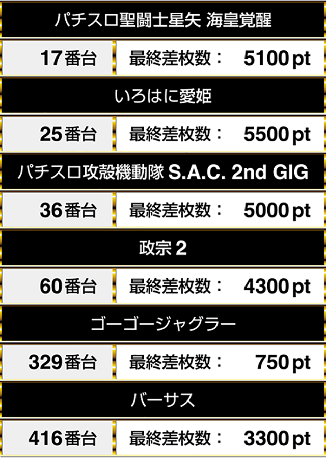『パチスロ聖闘士星矢 海皇覚醒』の17番台と『いろはに愛姫』の25番台が5000ptオーバー!!