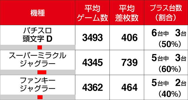 『パチスロ頭文字D』は6台中3台がプラス。5台設置の『スーパーミラクルジャグラー』は、3台がプラスを記録した。