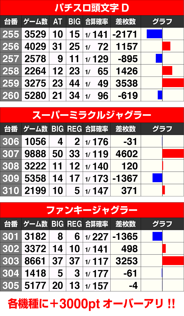 307番台の『スーパーミラクルジャグラー』はボーナス合算確率が1/120を上回り、差枚数は+4000pt超。『ファンキージャグラー』も303番台が+3000ptを超えた。