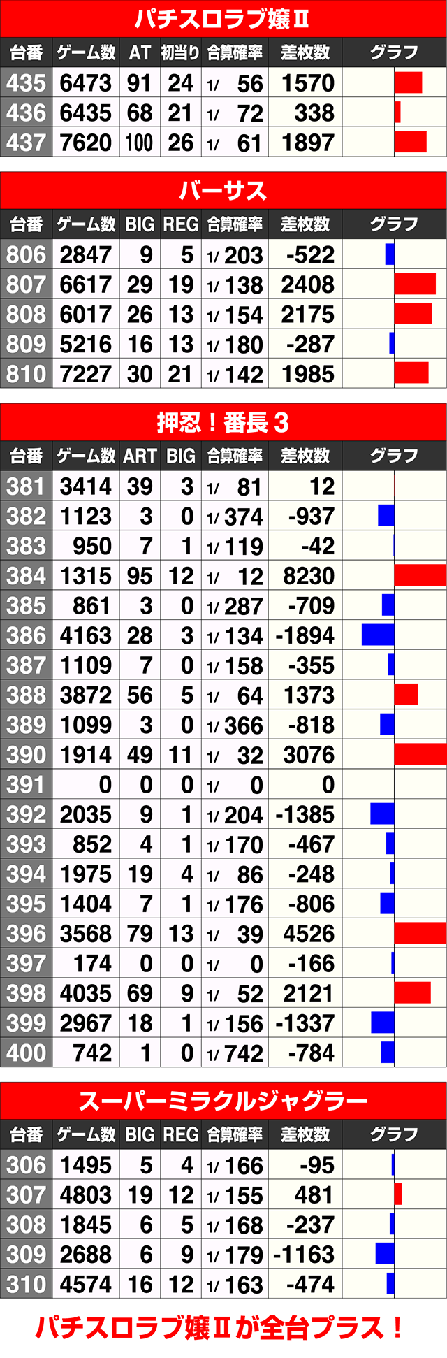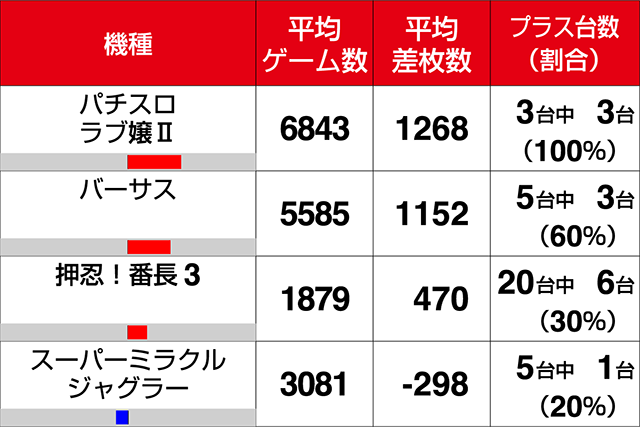 『バーサス』は2台がボーナス合算確率1/140クラス。プラスとなった3台のすべてが1900ptを超えるプラスとなった。