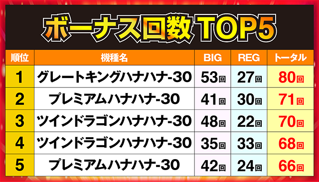 2位には「プレミアムハナハナ-30」、3位には「ツインドラゴンハナハナ-30」の名前が並び、どちらのボーナス回数も70回以上であった。