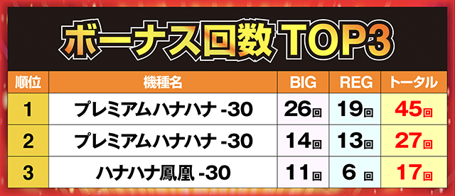 1位と2位に「プレミアムハナハナ-30」の名前が並び、ボーナス回数45回を記録した台が1位!!