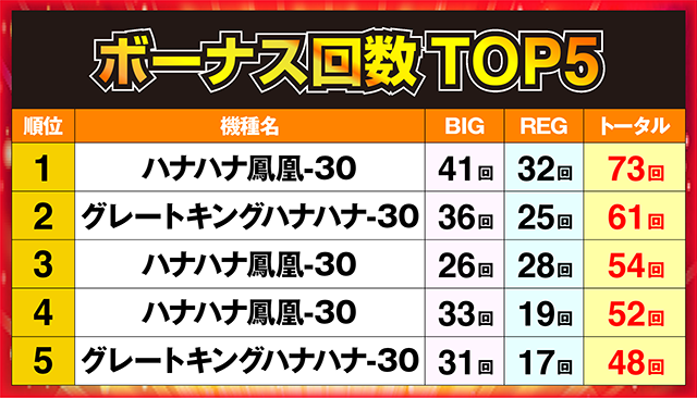 第1位に輝いたのは、73回を記録した「ハナハナ鳳凰-30」で、2位と12回もの差をつけて首位を獲得した。