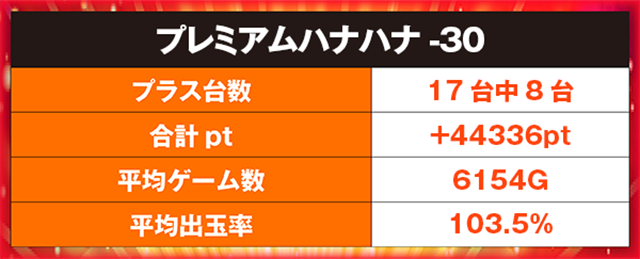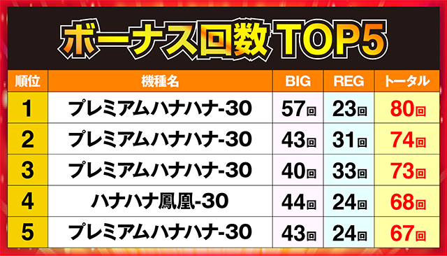4台がランクインした「プレミアムハナハナ-30」のなかの1台が、80回を記録して堂々の1位に輝いた。