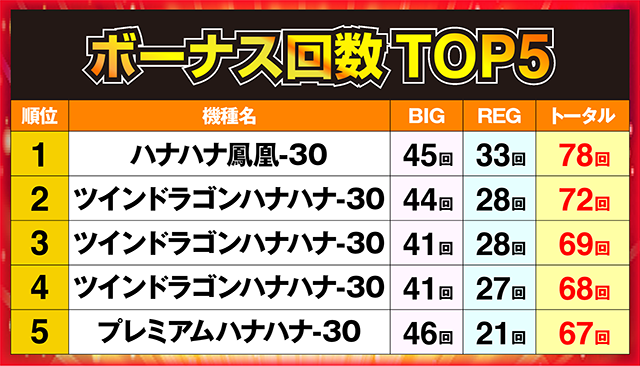 上位2台のボーナス回数は70回を超えており、78回を記録した「ハナハナ鳳凰-30」の1台が1位!!