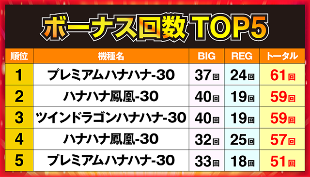 「ハナハナ鳳凰-30」や「ツインドラゴンハナハナ-30」と接戦を繰り広げた結果、「プレミアムハナハナ-30」がボーナス回数61回でトップの座を手にした。