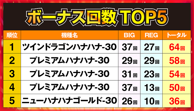 「ツインドラゴンハナハナ-30」の1台がボーナス回数64回で1位!