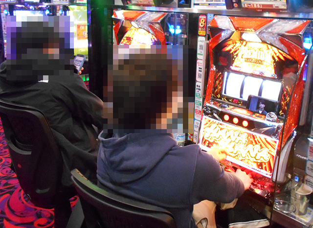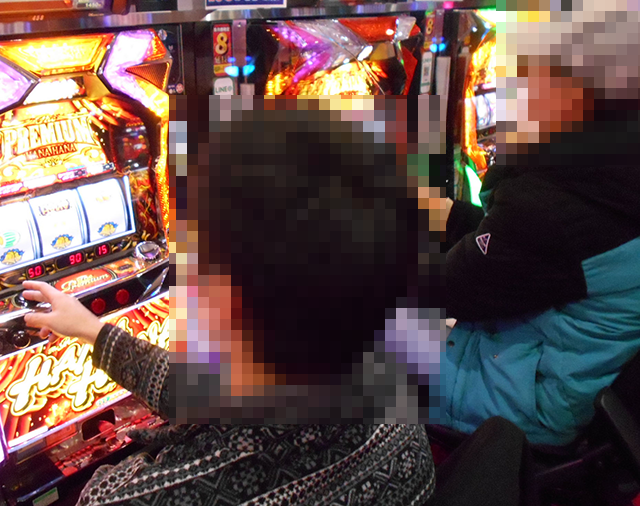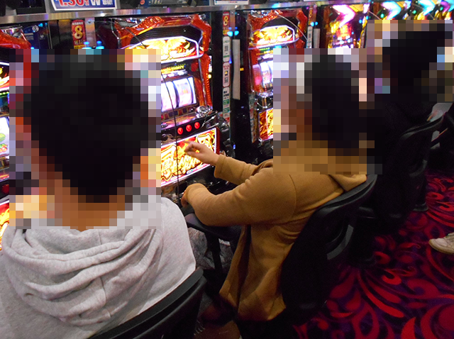 「ツインドラゴンハナハナ-30」も10台中6台が埋まっており、プレイヤーは笑みを浮かべて遊技をおこなっていた。