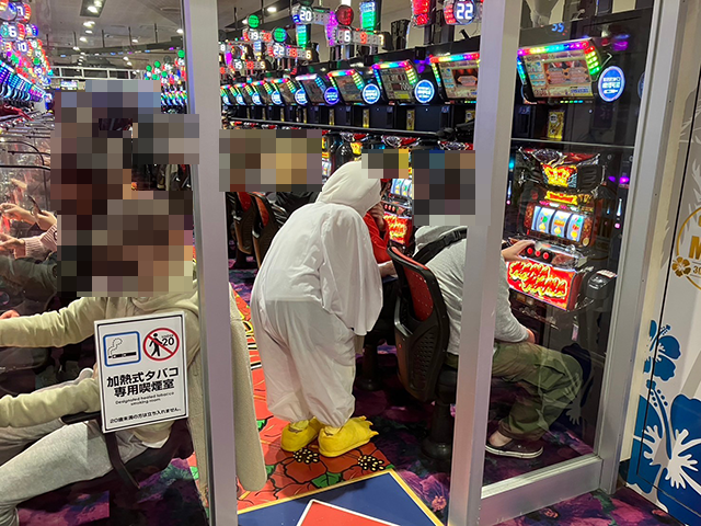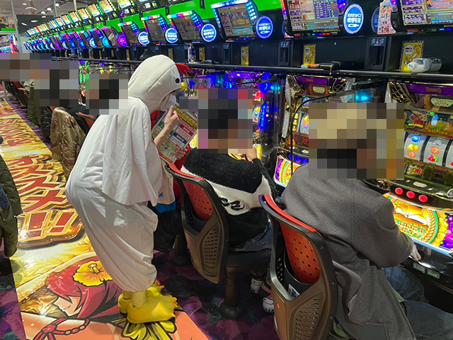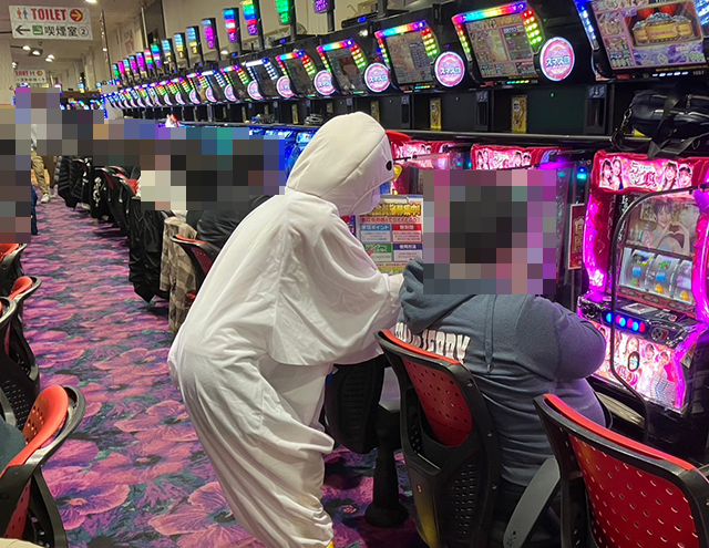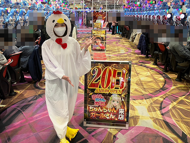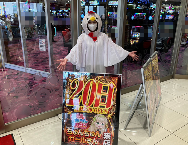 ニワトリの着ぐるみを着た上原真桜ちゃんと一緒に、パチスロコーナーをまわっていきますε=┌(*・ω・)┘