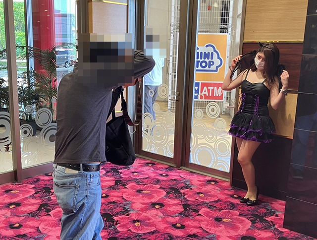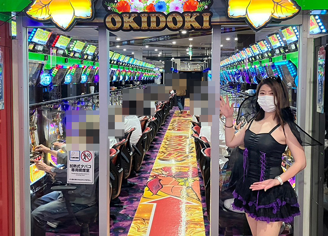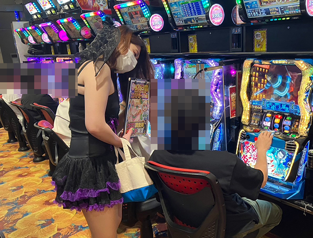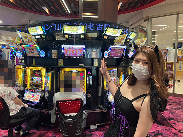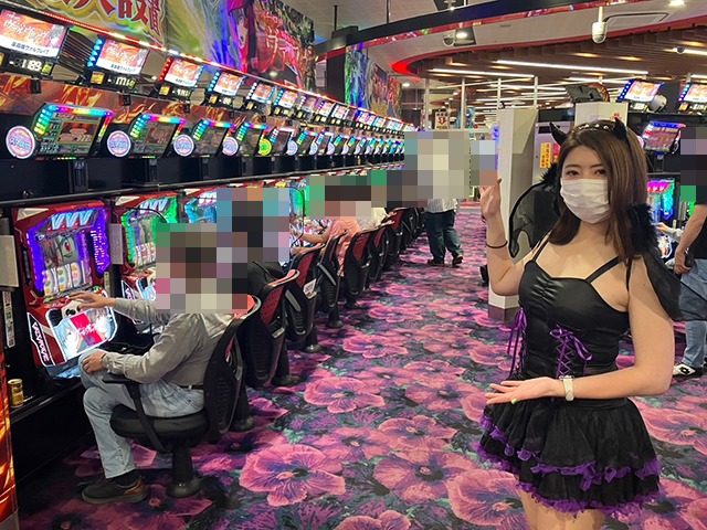 小悪魔風の衣装を着て、パチスロコーナーを中心に店内をまわっていきます!