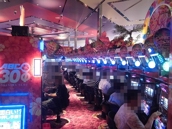 午後の20円パチスロで、とくに盛り上がっていたのが「沖ドキ!-30」。華麗なパフォーマンスを披露するプレイヤーがおり、シマは活気づいていた。