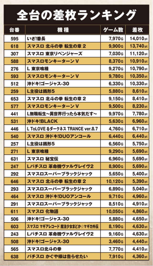 この日は、『いざ!番長』が+14,010ptを叩き出しランキングトップに。また、その他にも『スマスロ 北斗の拳 転生の章2』や『スマスロ 東京リベンジャーズ』、『スマスロモンキーターンV』に『L 東京喰種』、さらには『沖ドキ!ゴージャス-30』と様々な機種が万枚超を達成。複数のシマからハイスコアが連発する盛況ぶりを披露していた。