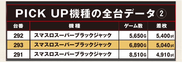 3台設置の『スマスロスーパーブラックジャック』は+5,000pt超が2台に+4,910ptと、全てがハイスコアをマークする圧巻の結果を残している。