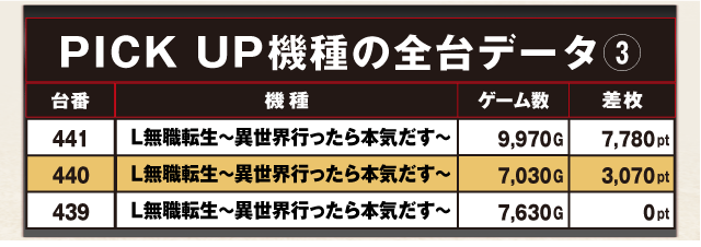 『L無職転生~異世界行ったら本気だす~』は441番台が+7,780ptを記録。しかも、マイナス差枚台が1台もなく、ファンにとっては充実の一日となったはずだ。