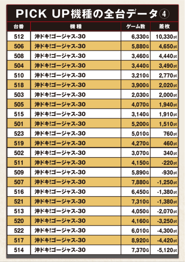 万枚超が飛び出した『沖ドキ!ゴージャス-30』は、その他にも+4,000pt超が2台に+2,000pt超が4台も発生。さらに、半数以上の台がプラス差枚で実戦を終えている。