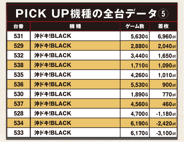 『沖ドキ!BLACK』は531番台から+6,960ptが発生。また、その他にも多数の好調台が確認されており、全11台のうちプラス域に届かなかったのはわずか3台だけであった。