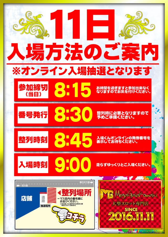 8:55までに整列して頂き、入場順番抽選を行います。 |