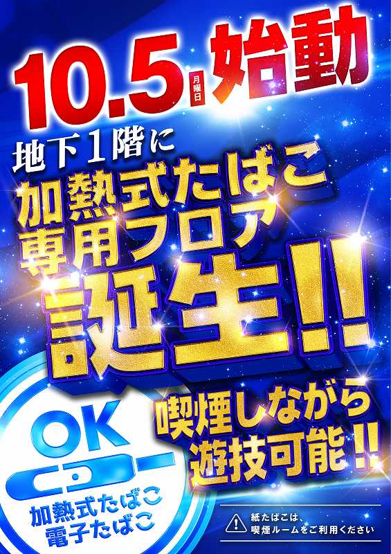 本日より地下加熱式たばこ喫煙OK!新台入替 朝9時開店