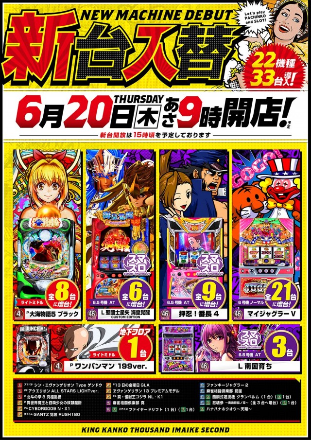 本日6月20日(木)朝9時開店🌞新台入替😎