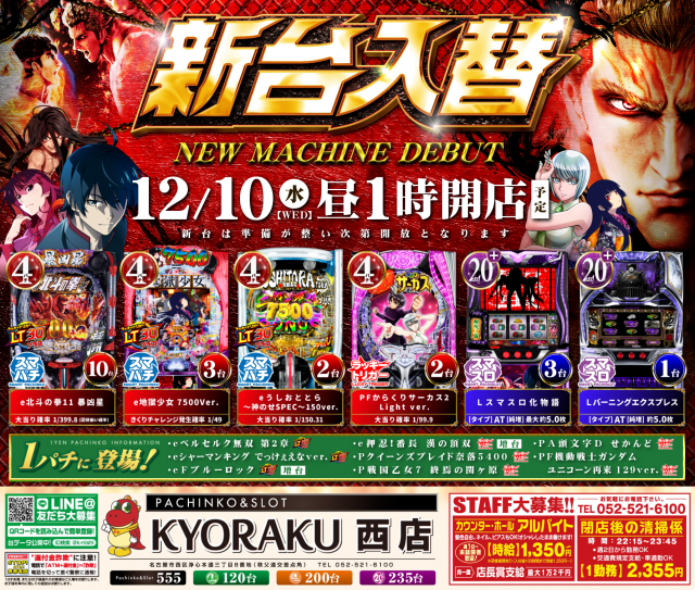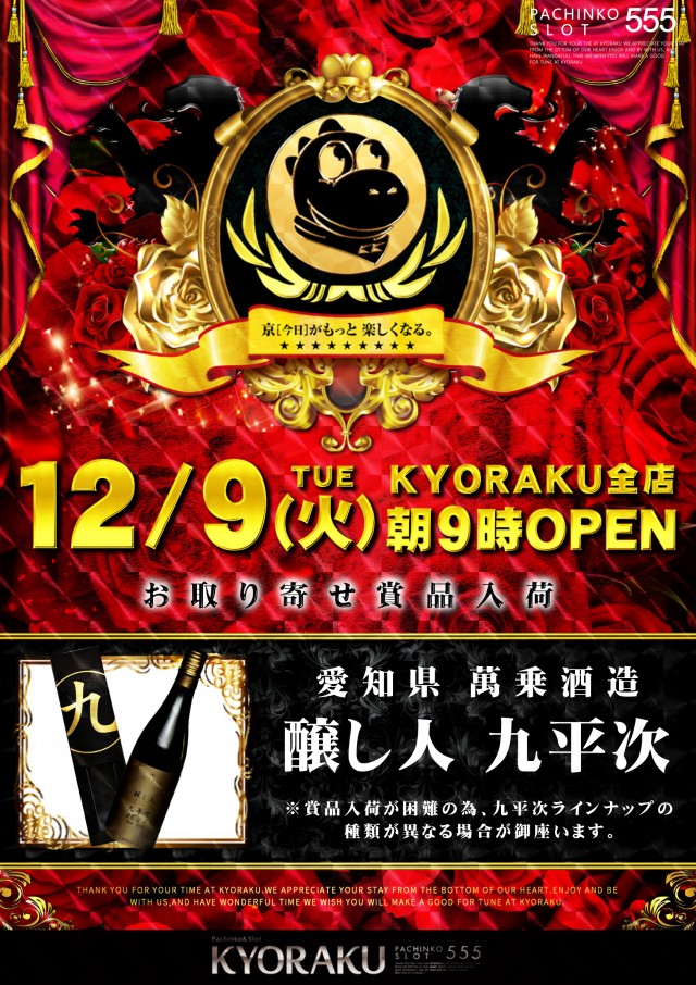 12月9日(火) KYORAKU全店 朝9時OPEN!
