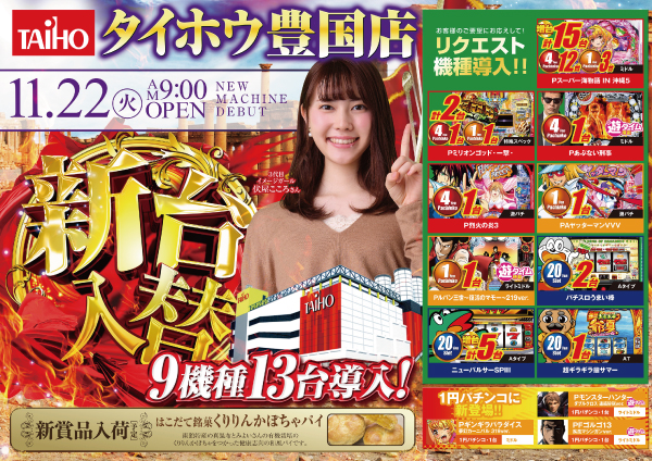 本日、タイホウ豊国店 新台入替!!9機種計13台導入!!