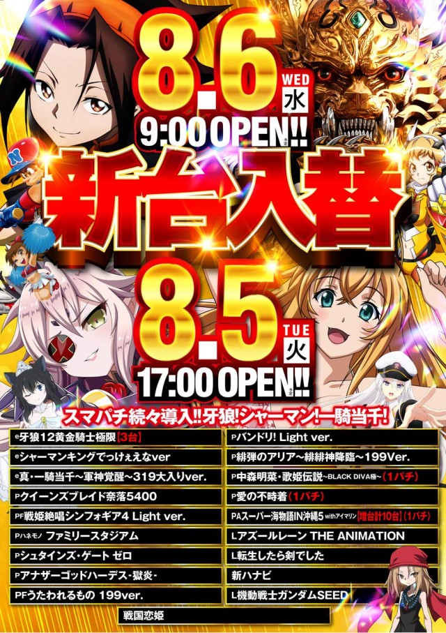 本日新台入替検査の為17時開店 明日8月6日新台入替初日🌈🌈