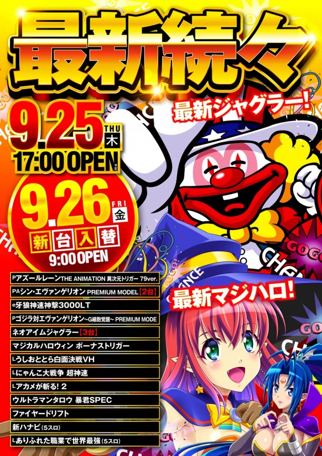 本日新台入替検査の為17時開店 明日9月26日新台入替初日🌈