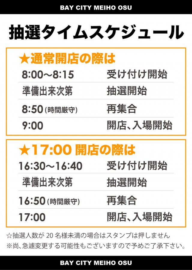 抽選受付は8:30~8:40(17時開店は16:30~16:40) |
