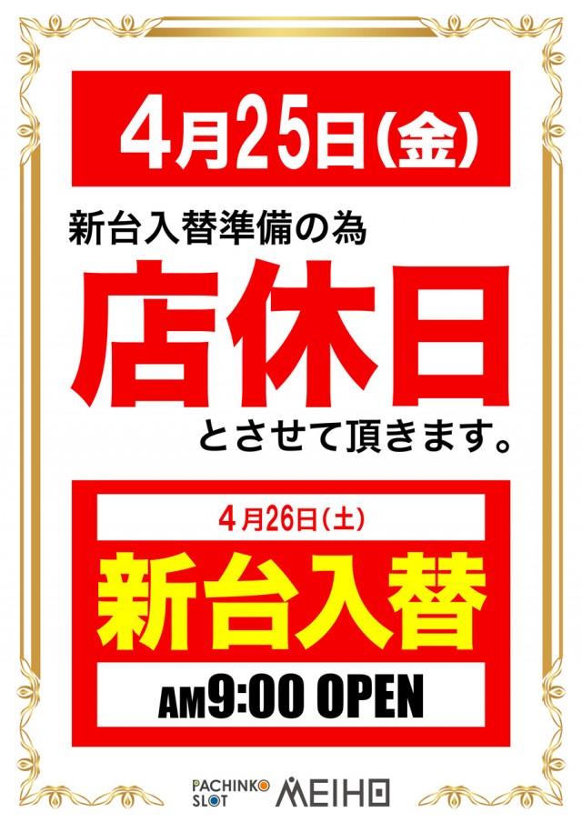 本日新台入替検査の為17時開店 明日4月8日新台入替初日
