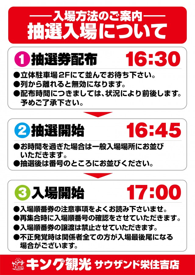 ①8:30頃から抽選順番券を配布いたします。 ②8:45頃から抽選を開始いたします。③9:00より入場開始です。※なお開店時間が異なる場合に置きましては、抽選時間も変更となります。 |