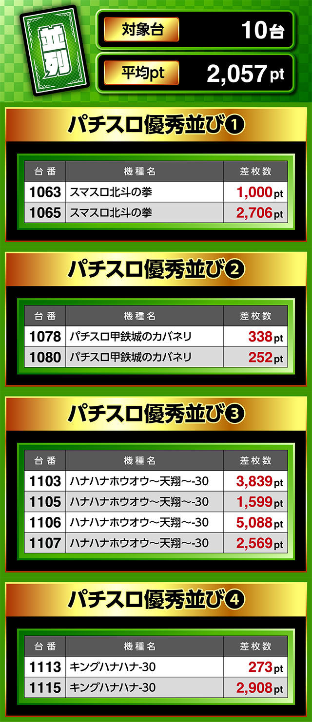 「ハナハナホウオウ~天翔~-30」は、1103番台から1107番台まで4台が並んで1,500ptオーバー。
