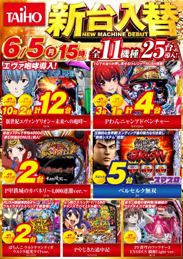 こんばんは!!明日20日は新台入替朝9時OPEN!!