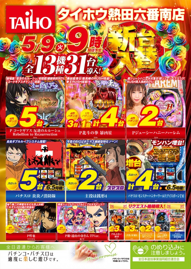こんばんは!!明日9日は新台入替朝9時OPEN!!