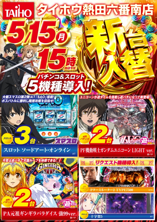 明日は店休日です。明後日9日は新台入替朝9時OPEN!!