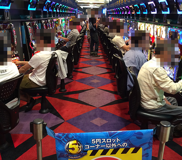 1円パチンコと5円パチスロでも朝から遊技を楽しんでいたプレイヤーは多く、どちらも空き台はほとんど見当たらなかった。