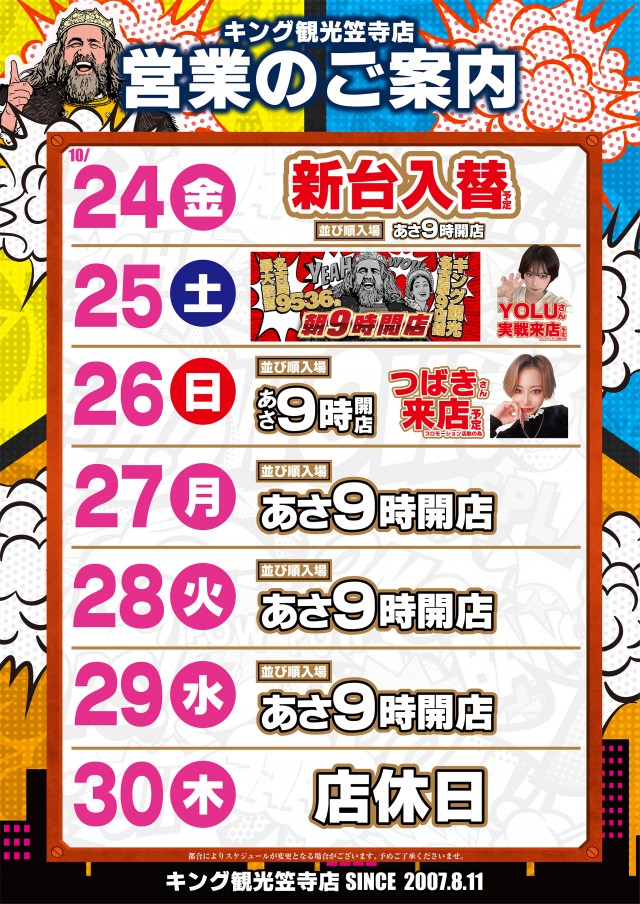 11月5日(木)店休日 11月6日(金)新台入替朝9時開店
