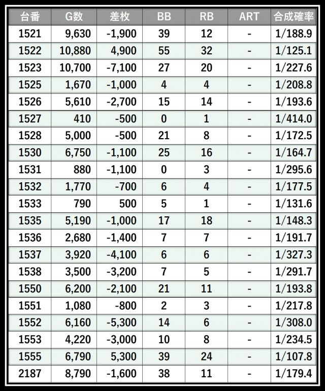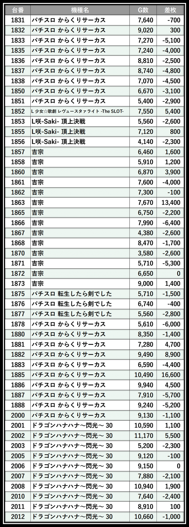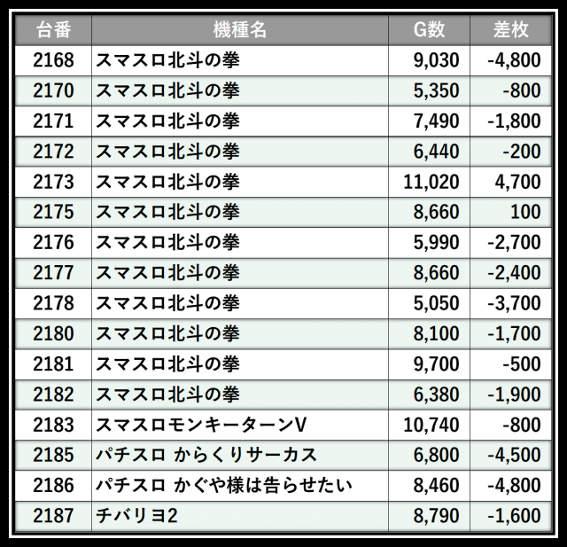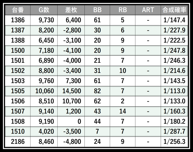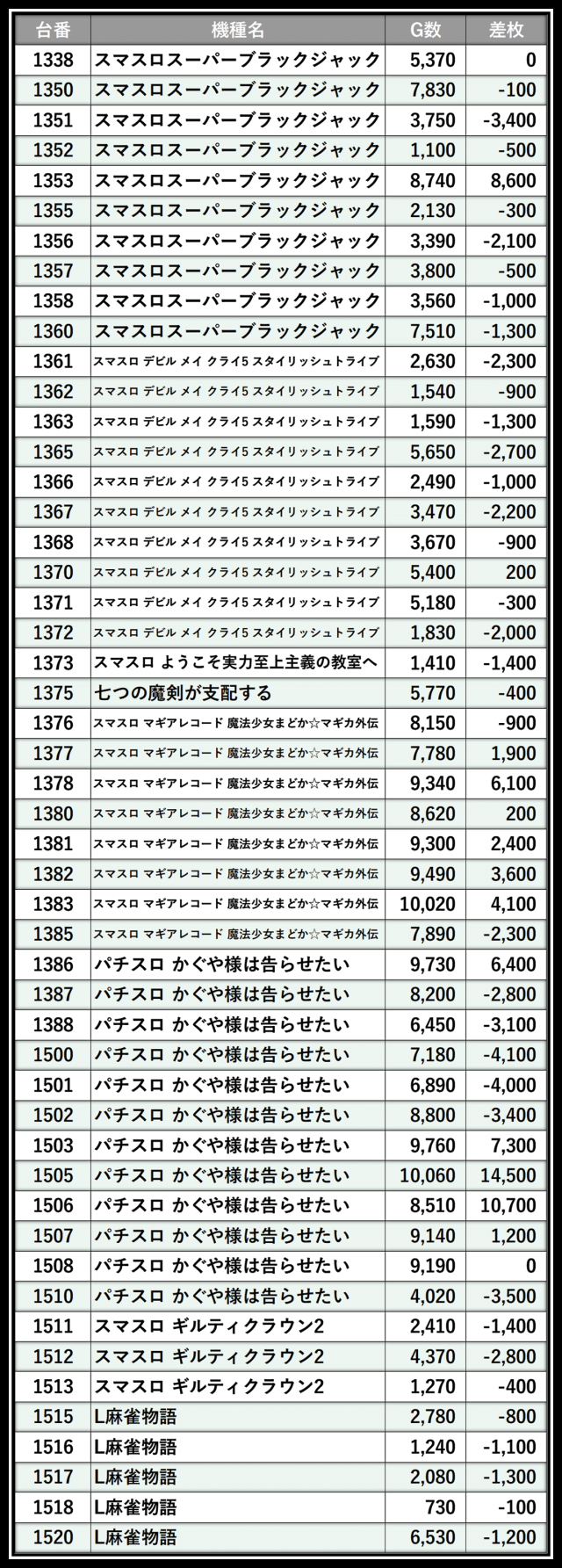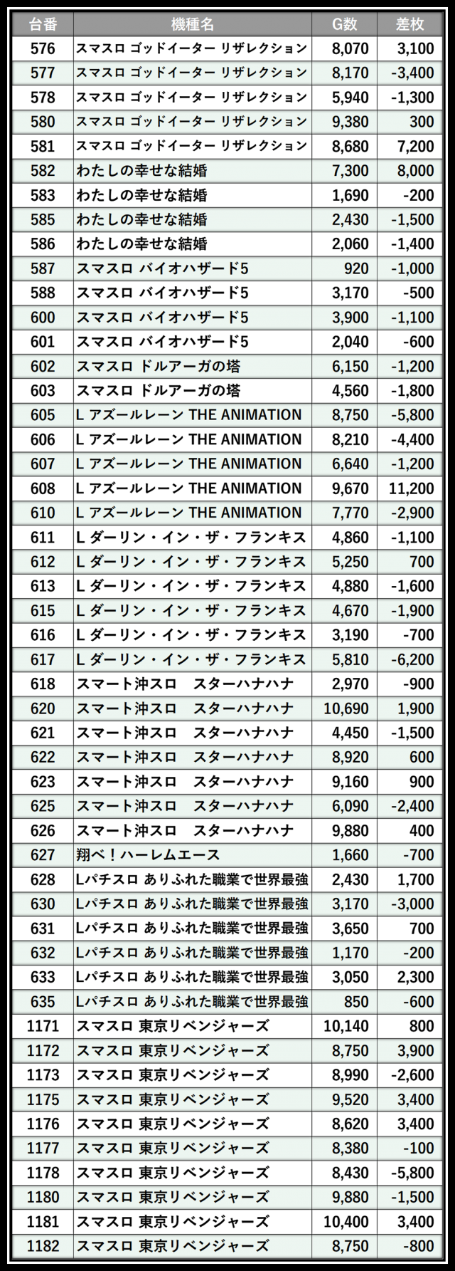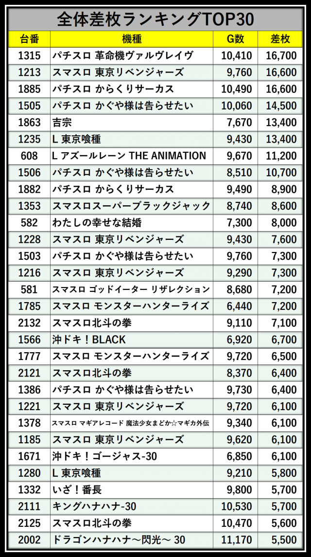 ※差枚数順に掲載しています