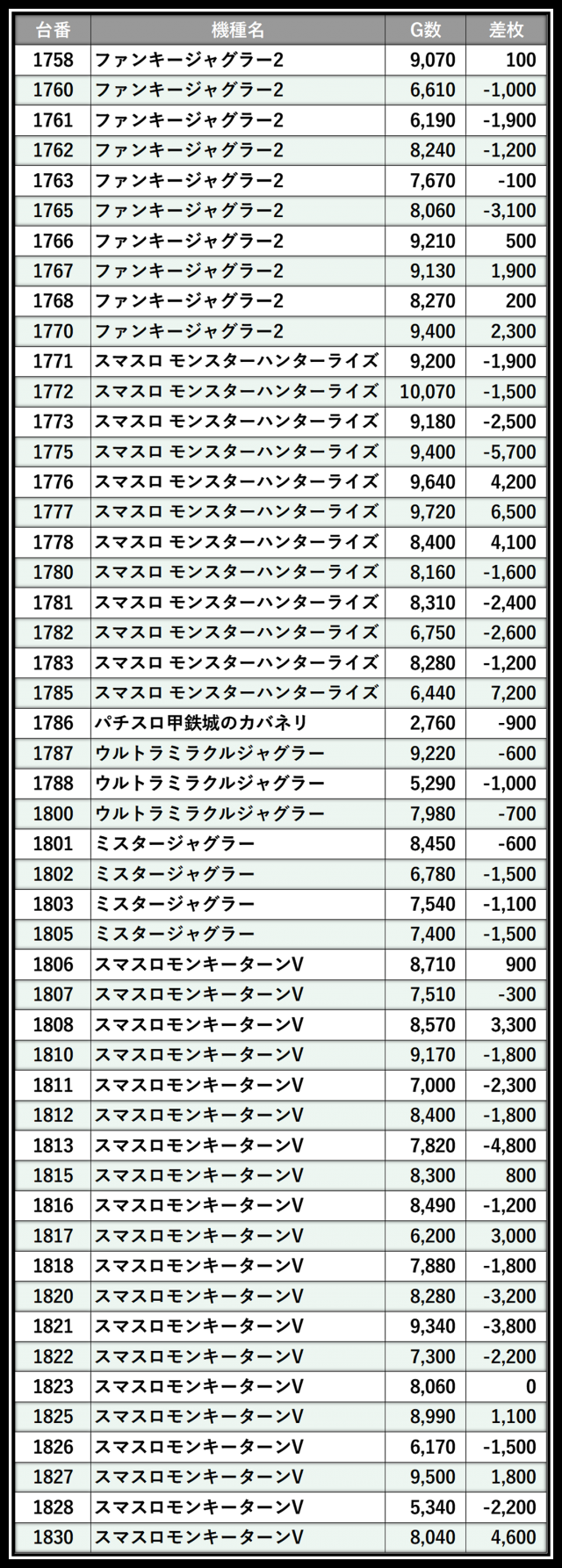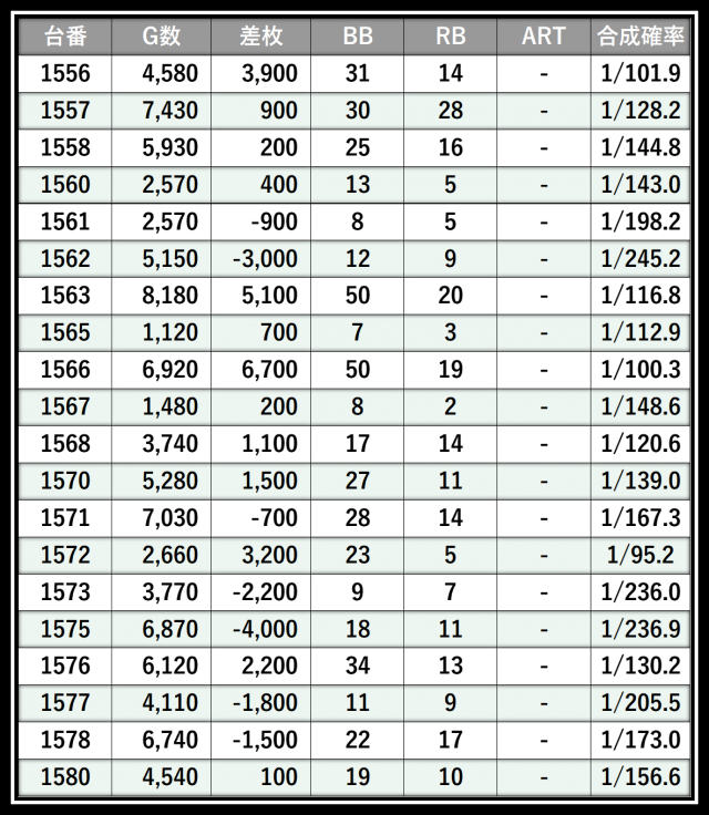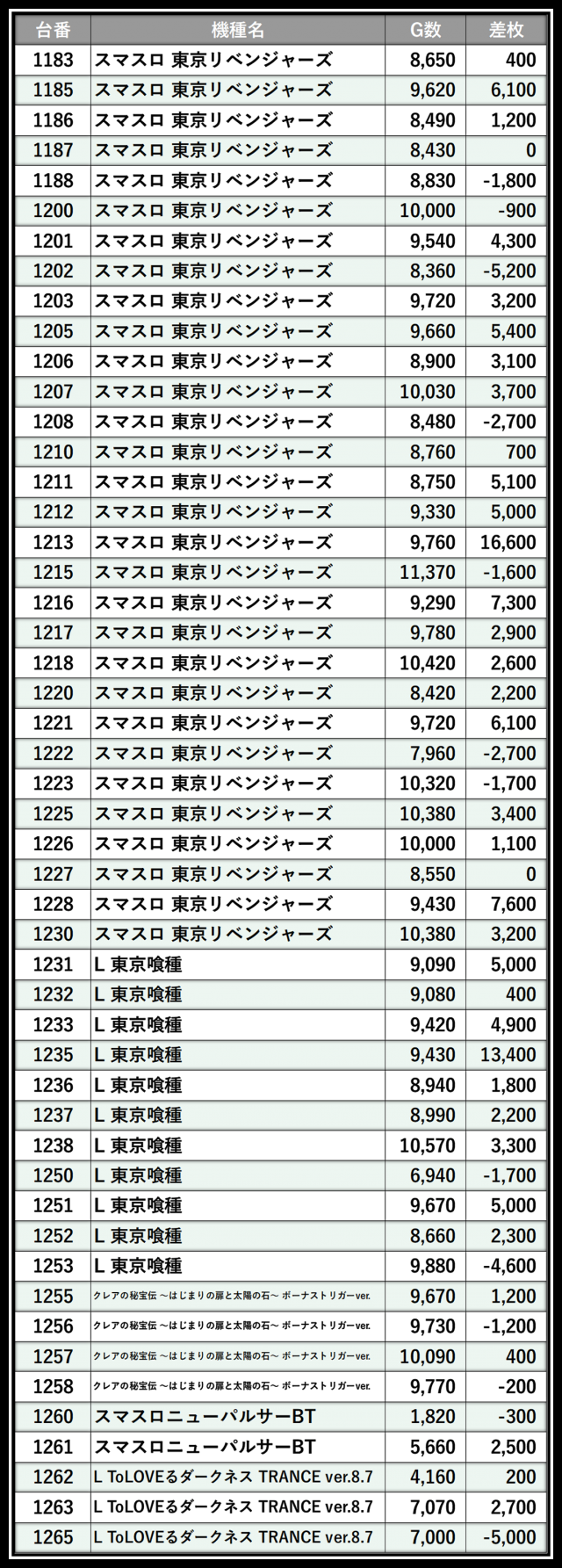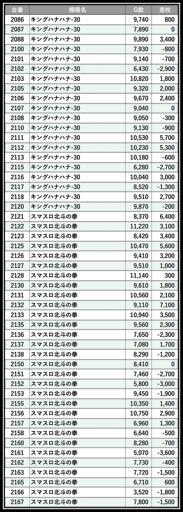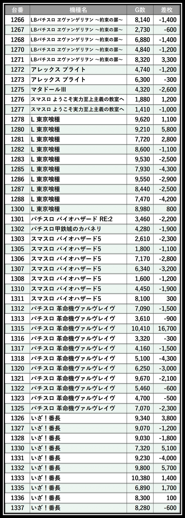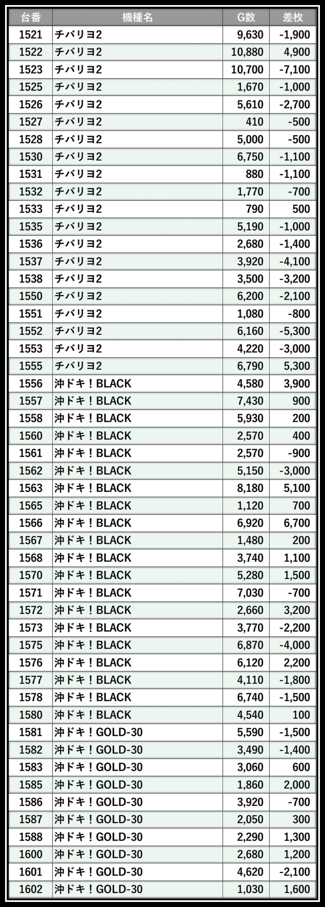 ※差枚数順に掲載しています