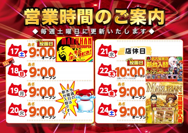 【マルハン名古屋南店】7月21日(水)店休日を頂きます。
