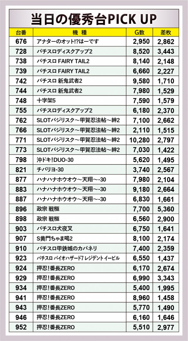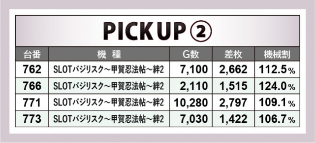 『パチスロ FAIRY TAIL2』『パチスロ 新鬼武者2』といった6.5号機の名前が見られた。『政宗 戦極』896番台+5,360枚という記録が生まれ、新時代の到来を予感せずにはいられない。それでも変わらず高い人気を見せつけたのが『SLOTバジリスク~甲賀忍法帖~絆2』『押忍!番長ZERO』だった。特に『SLOTバジリスク~甲賀忍法帖~絆2』では万回転OVERが発生し、相当な手ごたえを感じていた様子が窺える。