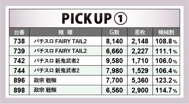 『政宗 戦極』896番台+5,360枚が当日の最高記録となった。『パチスロ FAIRY TAIL2』『パチスロ 新鬼武者2』でも8~9千回転OVER台が見られ、まとまった出玉を獲得している様子が印象的だ。他にも仲間に加わった6.5号機たちが活躍しており、将来的に盛り上がりの中心となる可能性を十分に感じられた。