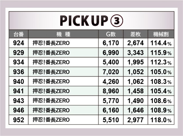 6.5号機の活躍があるとはいえ、まだまだ現役の『SLOTバジリスク~甲賀忍法帖~絆2』『押忍!番長ZERO』。特に『押忍!番長ZERO』では929番台+3,343枚が発生するなど、高いポテンシャルを発揮していたと言える。朝からじっくりと遊技された台も多く、ファンは有意義な時間を過ごしていたのではないだろうか。