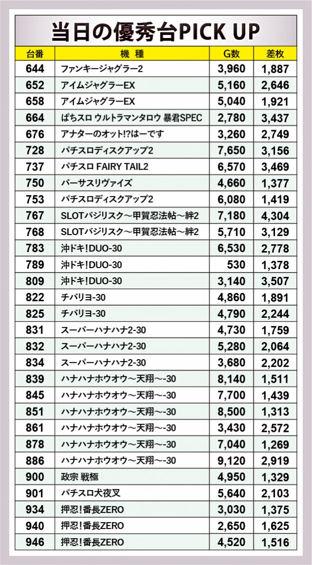 『ハナハナホウオウ~天翔~-30』は朝から閉店までじっくりと打ち込まれ、まとまった出玉を確保されていた。『スーパーハナハナ2-30』も同様で、同店における沖スロの信頼度を窺わずにはいられない。その一方で『SLOTバジリスク~甲賀忍法帖~絆2』767番台+4,304枚・768番台+3,129枚という記録が発生。盛り上がりをリードし、店内の活気と熱気に包みこんでくれた存在だ。