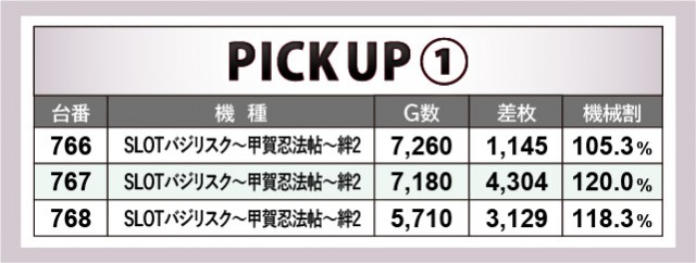 766~768番台の3台並びで好調さを披露していた『SLOTバジリスク~甲賀忍法帖~絆2』。やはり朝から打ち込まれており、ファンは回転数を重ねるごとに期待を確信へと変えていったことだろう。その中で生まれた767番台+4,304枚は当日の最高記録にもなっているため、やはり盛り上がりの中心にいたと言っても過言ではない。